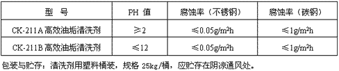 整个循环系统正常后,将CK-211A按一定比例用水稀释(推荐稀释比例为CK-211A:水=1:14),加入清洗系统中,加完后启动泵循环,同时把清洗剂加温到45~55℃,清洗全过程保持此温度,循环6~10小时。停止加热,将清洗液排尽,然后用清水置换,待PH值达到6~7时,停止置换。